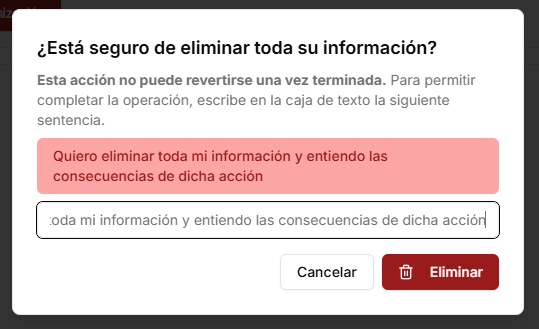 Haga clic en el botón de Eliminar organización. Un diálogo aparecerá para confirmar la operación. Léalo detenidamente. Para poder activar el botón, deberá escribir el mensaje solicitado en la caja de texto del diálogo.