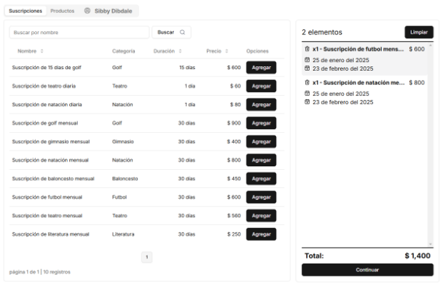 Una interfaz para realizar la operación le mostrará las suscripciones existentes. Agregue la o las suscripciones deseadas haciendo clic en el botón Agregar que corresponda. Del lado derecho observe los elementos agregados en la operación.
