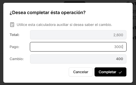 Un diálogo auxiliar se presentará para concluir la operación. En él puede introducir el monto recibido si desea calcular el cambio del cliente