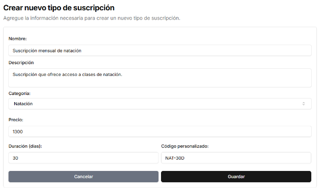 Agregue un nuevo tipo de suscripción haciendo clic en el Menú de usuario > Suscripciones, y enseguida haga clic en el botón de Crear nuevo tipo de suscripción y llene los campos correspondientes.